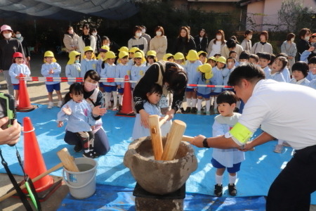 2歳児さんから年長さんまでのお友だちが杵を使って餅をつきました。流石に年長さんは、一人で杵を振り上げつくことが出来ていました。